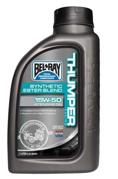 Half synthetische motor olie gemaakt door Bel-Ray. De Bel-Ray Thumper Racing Engine Oil is een hoogwaardige semi-synthetische multigrade motorolie. Deze olie is speciaal ontwikkeld voor de moderne eencilinder 4-takt motoren die de Motocross en Supermotard races domineren. Geschikt voor alle lucht- en vloeistofgekoelde eencilinder meerkleps 4-takt competitie motoren. Voor alle motoren met gescheiden of gecombineerde versnellingsbak. Wordt geleverd in een flacon met handige schenkdop van 1 liter.