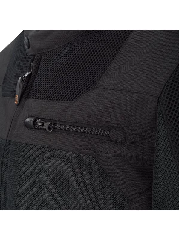 Deze jas is voorzien van CE Alpha schouderbeschermers en verstelbare CE Alpha elleboogbeschermers, welke verder uit te breiden zijn dankzij een vak voor een CE rugbeschermer. Om je nog beter te beschermen tijdens je rit zijn er reflecterende elementen geplaatst om beter op te vallen in donkere situaties.