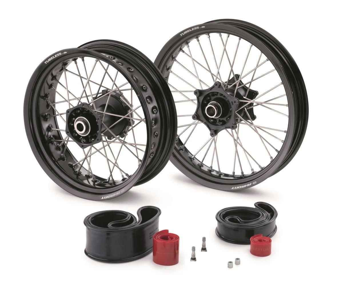 Bevat alle componenten die nodig zijn om de standaard gegoten wielen om te bouwen naar spaakwielen. Voorwiel 3,0×19″, achterwiel 5,0×17″. Kit zonder bandenspanningssensoren, alleen standaard ventielen inbegrepen.