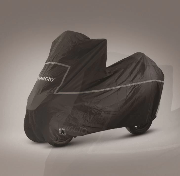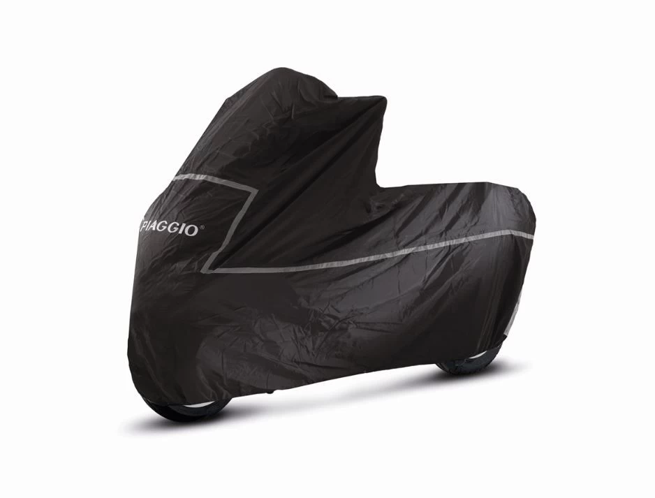 Beschermhoes met openingen voor accessoires. Kleur zwart met reflector strip, transparante kentekenplaat venster. Voorzien van het Piaggio logo. Speciaal ontworpen voor de Piaggio MP3 en X10.