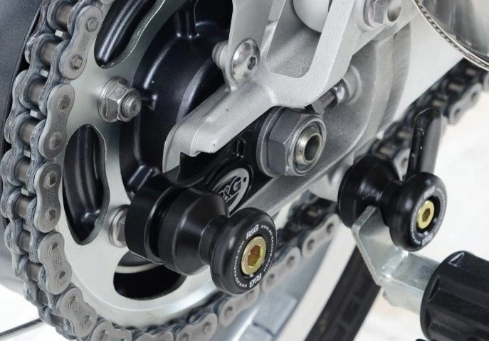 Wanneer er geen schroefdraad in de achterbrug is om een bobbin te monteren kan de R&G “Offset Cotton Reels” gebruikt worden. Zo kan er via de kettingspanner/achteras toch een bobbin op de motor gemonteerd worden en kan de motor dus met een paddockstand veilig en stevig gestald worden. Ook beschermen de bobbins de achterbrug bij een val.