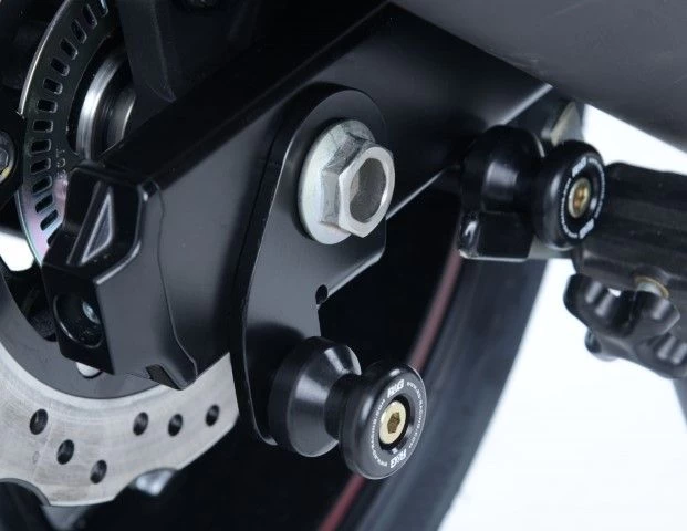 Wanneer er geen schroefdraad in de achterbrug is om een bobbin te monteren kan de R&G “Offset Cotton Reels” gebruikt worden. Zo kan er via de kettingspanner/achteras toch een bobbin op de motor gemonteerd worden en kan de motor dus met een paddockstand veilig en stevig gestald worden. Ook beschermen de bobbins de achterbrug bij een val.