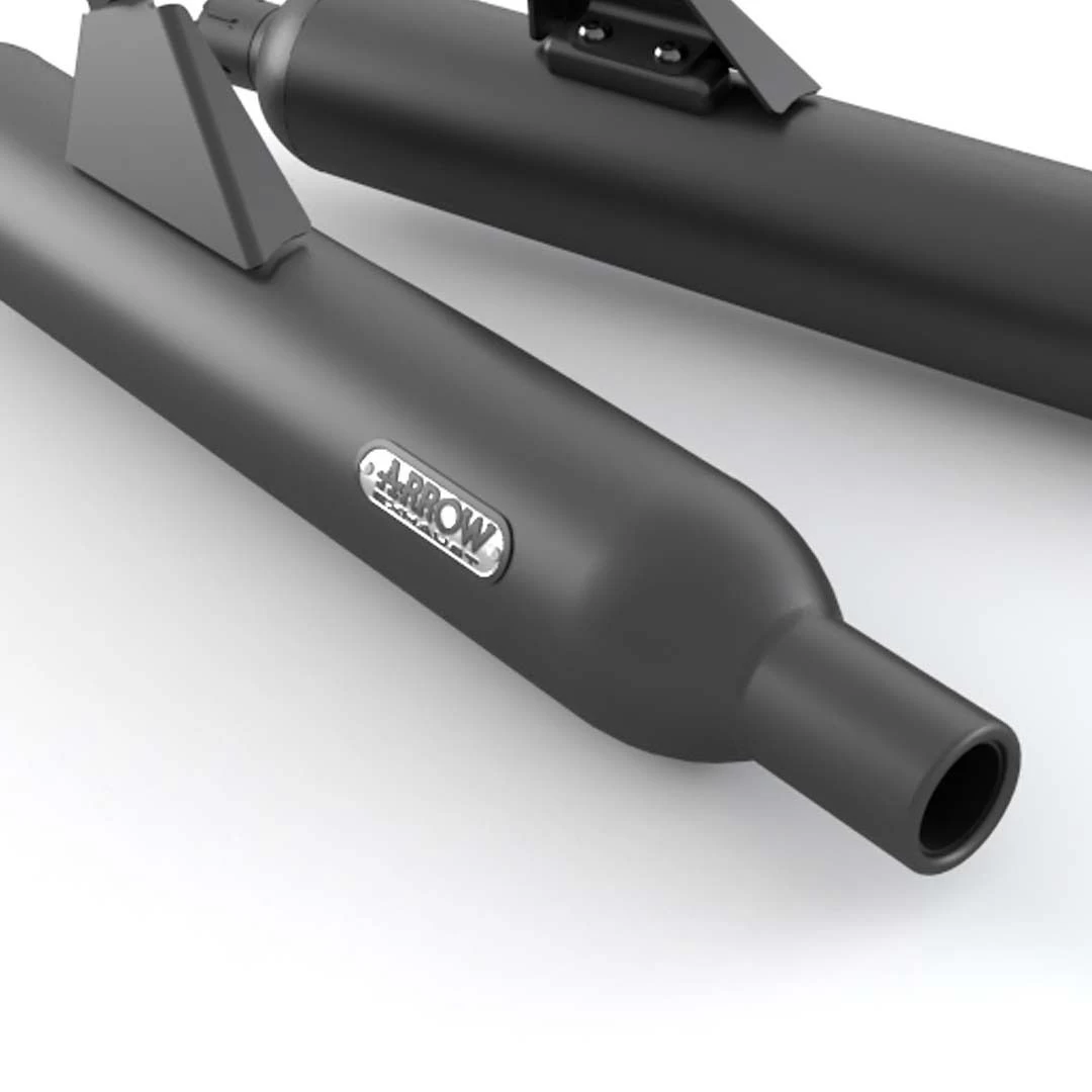 Triumph T100 Arrow Black Peashooter slip-on uitlaat – A9601759 De Triumph T100 Arrow Black Pea Shooter Slip On-uitlaat MPN A9601759 is een paar roestvrijstalen slip-on-uitlaten in peashooter-stijl afgewerkt met een zwarte keramische coating. Vervaardigd door uitlatenspecialist Arrow, zijn ze ontworpen om korter en lichter te zijn dan de uitlaat van de originele uitrusting, en ontworpen om een grotere uitlaatpijpdiameter te bieden. Combineer met de Triumph T100 Black Exhaust Header om de gestroomlijnde zwarte stealth-look compleet te maken.